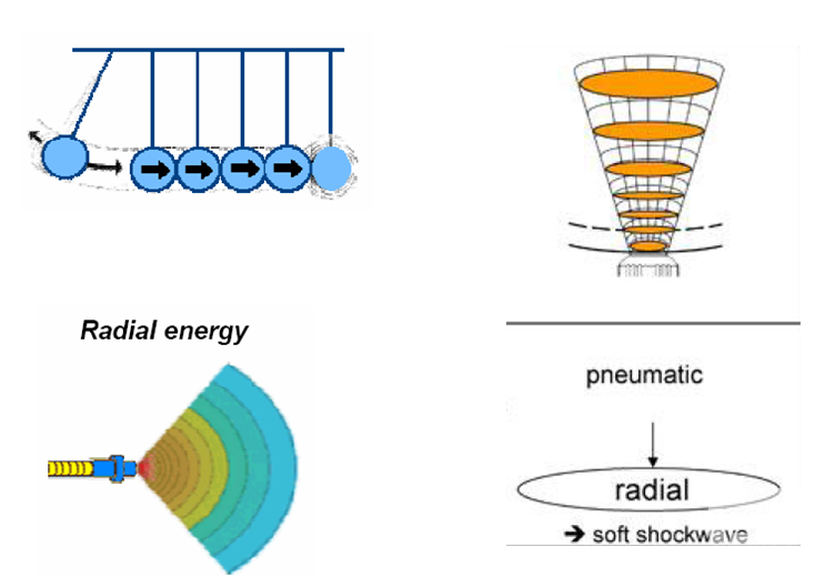 冲击波的机械产生过程,即其中最新的并且同时也是应用非常广泛的一种过程,是应用弹道学技术,射弹依靠被压缩的空气,强有力的加速击打冲击头,这个冲击头带有高动力能量与皮肤接触。通过使用耦合剂,例如超声波耦合剂或是蓖麻油,这种击打冲击头的冲击力将以冲击波的形式传送到组织。从那里冲击波以球面或球形的冲击波形展开,它以放散状的式样扩散,所以在这里以“放散状冲击波”来形容。